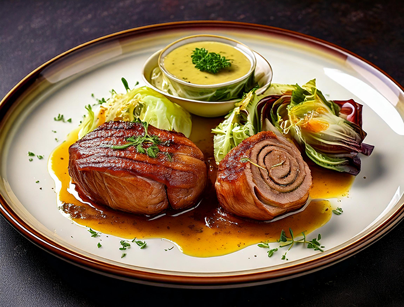 • Teller mit Chicorée in Currysoße, daneben kleine Schale mit weißer Sauce, gewürzt mit schwarzem Pfeffer.